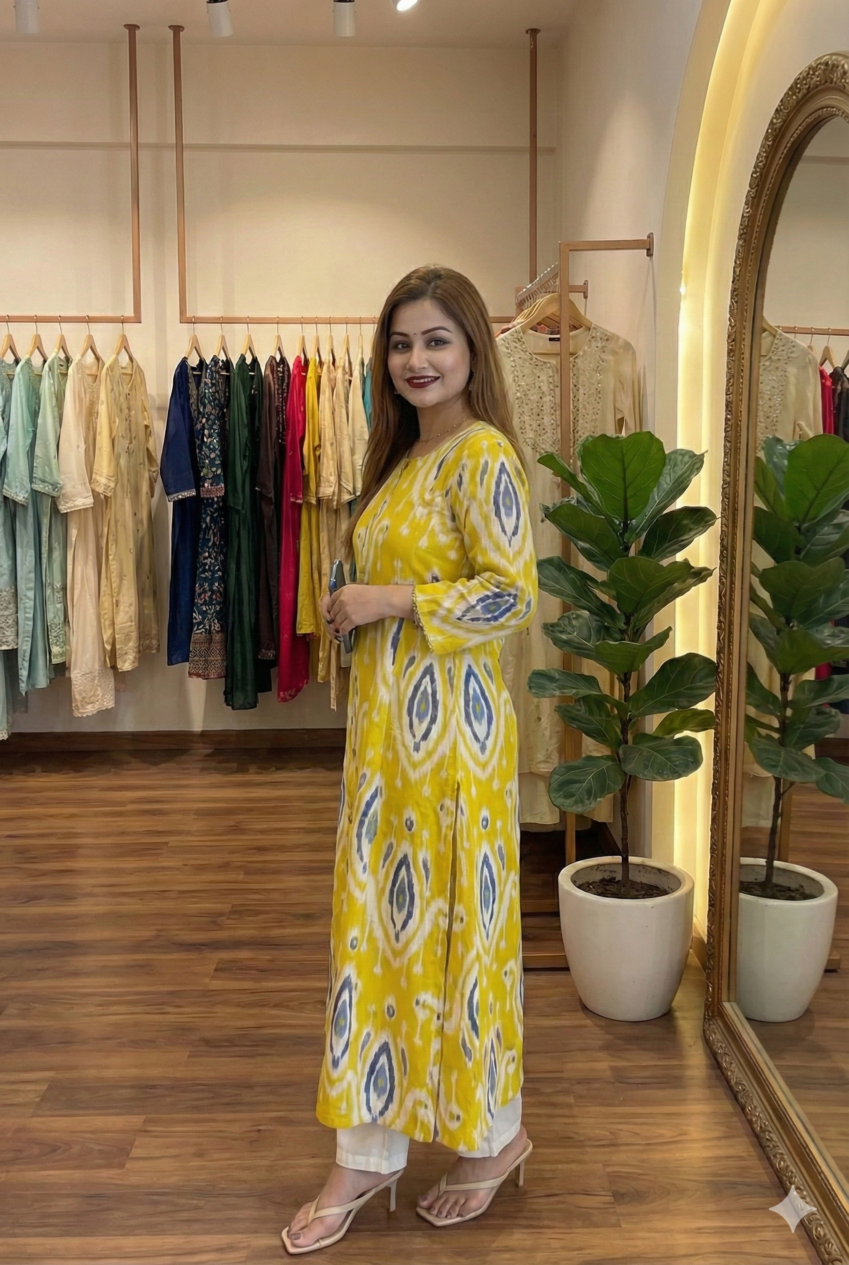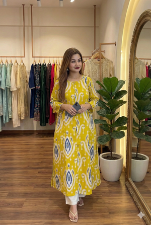 | Kurta set Detailing | The A-line or straight-cut long kurta features a classic round neckline and three-quarter sleeves, offering a clean and modest silhouette that is versatile for both professional and casual settings. |