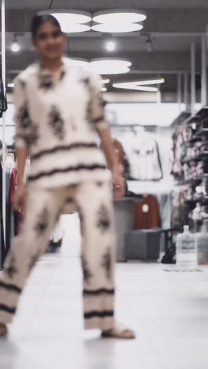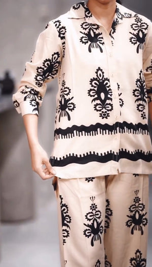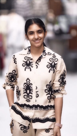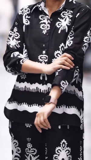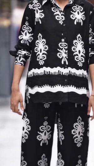 | featuring:- | A relaxed-fit button-down shirt and matching wide-leg trousers. Perfect for brunch outings, casual office days, vacation wear, airport looks, or weekend get-togethers. |